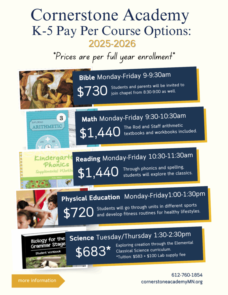 We are so pleased to be offering Pay Per Course Classes at our school! This is designed for families who may be interested in various classes, and would like to sign up for one or more, instead of the whole school day. We have many amazing classes to choose from! Please do not hesitate to reach out to us with any questions you may have! Contact us via email at gro.nmymedacaenotsrenrocobfsctd-943ea2@pedirbcm or via phone at 612-760-1854.